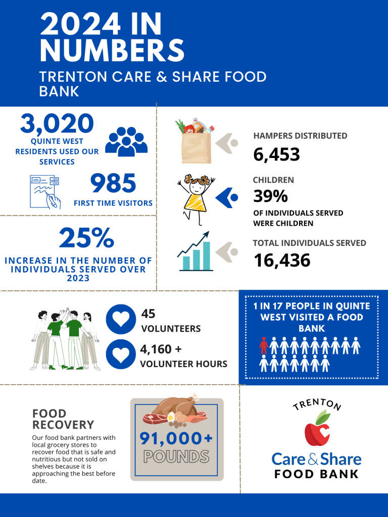 If you would like to contribute to the vision of a food secure Quinte West, please consider volunteering or donating to the Trenton Care & Share Food Bank or one of the following local organizations: